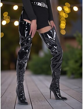 stivali neri da donna con tacco a spillo sopra il ginocchio - eleganti stivali alti fino alla coscia in similpelle con punta affilata per le serate fuori