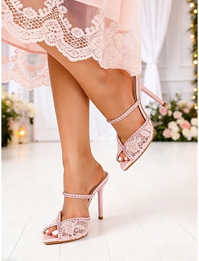 tacchi a spillo in pizzo rosa da donna - eleganti mules aperte con cinturini di strass, stile romantico ed elegante, perfetti per le damigelle ai matrimoni