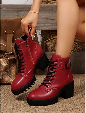stivaletti stringati in similpelle rossa da donna – tacchi a blocco spessi con cerniera e fibbia, stivali da esterno alla moda e resistenti