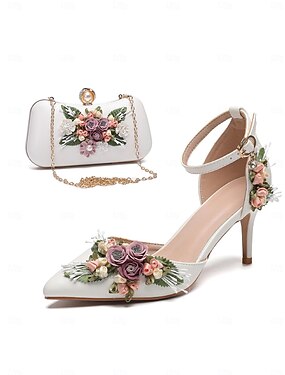 décolleté con tacco alto e fiori bianchi con pochette abbinata – scarpe romantiche da sposa e per occasioni speciali per donna zeppa con fiocco di strass blu
