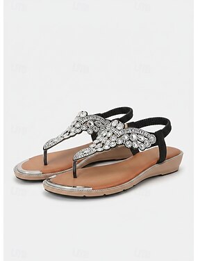 Sandali bassi da donna neri scintillanti con cinturino a T: un tocco chic e scintillante per vacanze al mare, passeggiate in riva al mare e viaggi su isole tropicali.