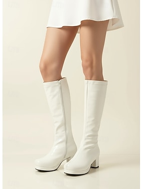 stivali alti fino al ginocchio in vernice bianca da donna con cerniera laterale - stivali con tacco spesso in stile disco vintage anni '70 per cosplay, moda retrò ed eventi