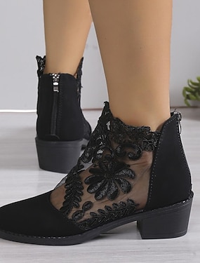 stivaletti da donna in pizzo nero con motivo a rete floreale e tacco basso a blocco - calzature eleganti per occasioni casual ed eleganti