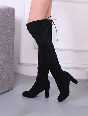 stivali da donna con tacco a blocco sopra il ginocchio: stivali alti fino alla coscia in pelle scamosciata con lacci sul retro, eleganti calzature autunnali e invernali per serate fuori, feste e look street style
