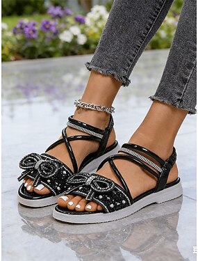 sandali bassi da donna con cinturino alla caviglia in strass neri - sandali aperti con brillantini e gioielli, sandali eleganti e comodi da indossare tutti i giorni