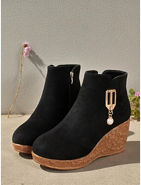 stivaletti neri con zeppa da donna – stivaletti eleganti con tacco alto e fodera in pile, cerniera laterale e dettagli decorativi in perle sintetiche, calzature versatili per l'autunno, l'inverno e le occasioni eleganti