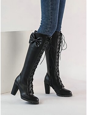 stivali alti fino al ginocchio da donna con lacci marroni, fiocco e tacco a blocco – cosplay lolita vintage vittoriano ed edoardiano, moda retrò e calzature da festa