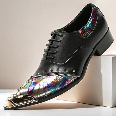 Scarpe Oxford da uomo nere multicolore con lacci, punta affusolata e puntale in metallo, ideali per matrimoni, banchetti, feste, eventi di moda, balli di fine anno e serate di lusso.