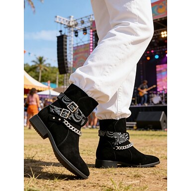 Stivaletti western da uomo color cuoio con cinturino a catena, stivali da cowboy alla moda per festival musicali, concerti, stile rodeo, feste all'aperto, streetwear e look audaci e di tendenza.
