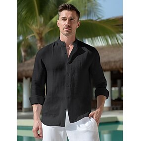 100% lino Tasche Per uomo camicia di lino Camicia Camicia da spiaggia Nero Bianco Blu marino scuro Manica lunga Liscio Colletto Mao Primavera & Autunno Esterno Giornaliero Abbigliamento