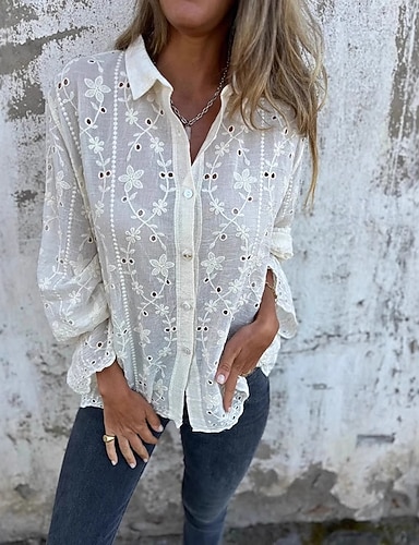 Per donna Blusa Finto cotone e lino Patchwork Traforato Bottoni Semplice Elegante Classico Moderno Manica Lunga Colletto a Camicia Top Regolari Quotidiano Ferie Uscire Bianco Estate Primavera Autunno