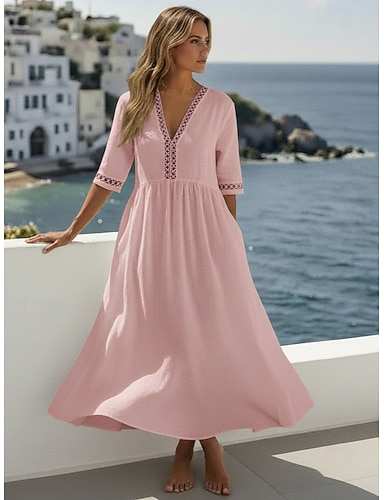 Per donna Abito Midi 100% cotone Abito a Tubino Abiti in cotone e lino Vestito Casual Essenziale Classico Casual Quotidiano All'aperto Vacanza Vestibilità comoda Semplice Mezza Manica Scollo a V