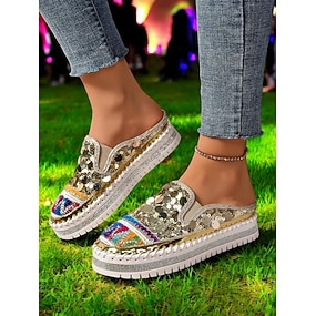 mules con plateau e paillettes dorate da donna – scarpe slip-on scintillanti con dettagli ricamati per festival, feste e moda di strada