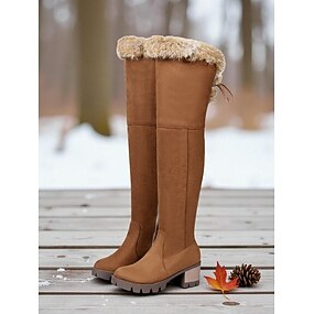 stivali invernali marroni da donna sopra il ginocchio: rifiniture in pelliccia sintetica, tacco spesso e largo, stile caldo per il freddo, per feste e abbigliamento all'aperto