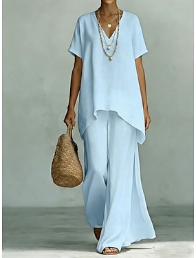 set da donna, due pezzi, finto cotone e lino, moda casual, comfort, casa, quotidiano, vacanza, lino, estate, primavera, abiti per la casa