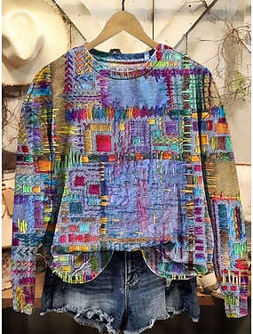 T shirt da donna a maniche lunghe con scollatura a girocollo tunica lunga grafica geometrica vintage casual top regolari stampa quotidiana rosa blu viola verde primavera autunno precaldo