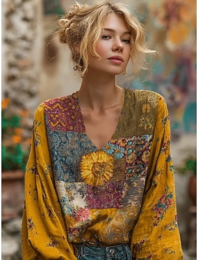 Blusa Boho da donna simile al lino traspirante leggera floreale elegante Bohemia tropicale maniche lunghe scollatura a V tops regolari stampa patchwork bottoni gialla azzurra primavera