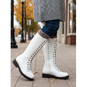 stivali da combattimento bianchi con lacci da donna, stivali classici casual preppy in pelle sintetica verniciata a metà polpaccio per ufficio, abbigliamento casual e attività all'aperto