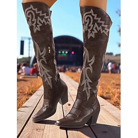 stivali da cowboy marroni da donna sopra il ginocchio - stivali da cowboy ricamati in similpelle con punta affilata e tacco a blocco per lo street style, outfit casual autunnali e invernali e per