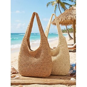 Borsa tote da donna in stile bohémien, capiente, con cerniera, leggera, in paglia intrecciata, colore bianco sporco. &color kaki, perfetto per le vacanze al mare &abbigliamento casual per tutti i