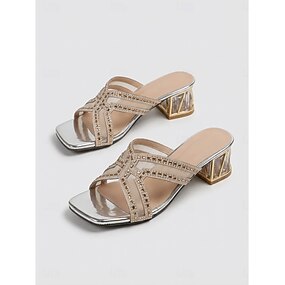 Eleganti sandali da donna in rete argentata con strass scintillanti - chic sabot a punta quadrata con tacco a blocco trasparente dal design architettonico, perfetti per la sera, i resort e i cocktail