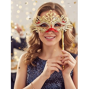 maschera da ballo da donna con strass e manico - elegante oro &maschera rossa portatile per feste di Capodanno, balli &eventi di danza formale