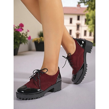 oxford stringate da donna in pelle scamosciata bordeaux e similpelle verniciata con tacco spesso – stile vintage anni '70, perfette per uscite informali, autunnali e riunioni del fine settimana