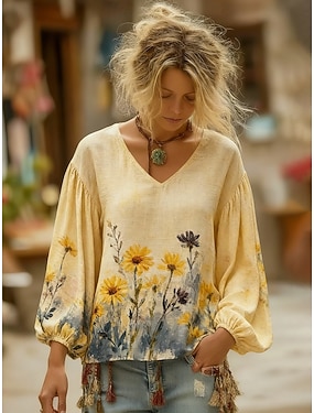 Per donna Camicia Camicia Boho Finto cotone e lino Stampato Floreale Bohemien Vintage Classico Manica Lunga Scollo a V Top Regolari Quotidiano Ferie Uscire Giallo Azzurro cielo Arancione Estate
