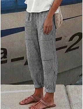 Per donna Finto cotone e lino Pantaloni Pantaloni casual Pantaloni Estivi Vacanza Moda Streetwear Lunghezza intera Vita Alta A righe Tasca Elastico in vita Comodità Inelastico Quotidiano Vacanza Ferie