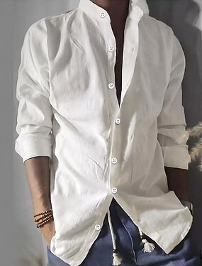 Per uomo Camicia Camicia con colletto a fascia Camicia estiva Abbigliamento mare Camicia con bottoni Tinta unica Strada Giornaliero Bianco Manica lunga Colletto alla coreana Primavera & Autunno