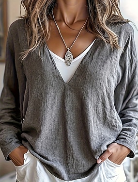 Per donna Blusa Finto cotone e lino Patchwork Semplice Elegante Vintage Manica Lunga Scollo a V Top Regolari Quotidiano Ferie Uscire Giallo Blu marino Grigio Estate Primavera Autunno