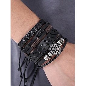 Set di braccialetti in pelle multistrato in stile vichingo da uomo - polsino intrecciato vintage con ciondoli dorati, perfetto per abbigliamento casual, regali e accessori street style