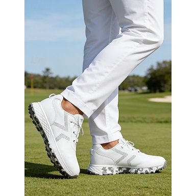 scarpe da golf bianche da uomo, design pulito con lacci, suola ammortizzata leggera, stile sportivo classico per campi da golf e abbigliamento outdoor