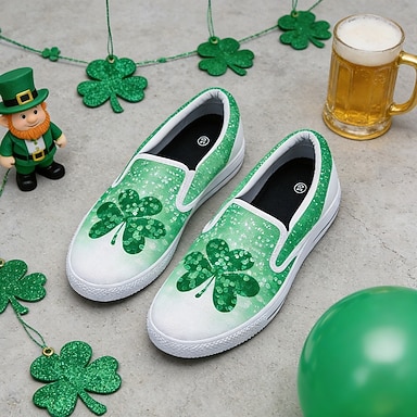 sneakers slip-on da donna per il giorno di San Patrizio con stampa di un simpatico cane e trifoglio: comode scarpe in tela verde per sfilate, festival e abbigliamento casual
