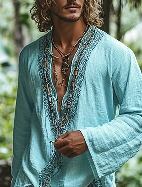 Per uomo Camicia Camicia di lino Camicia popover Camicia Estiva Abbigliamento da spiaggia Semplice Vacanza Ferie Azzurro cielo Manica Lunga Scollo a V profondo Estate Primavera Abbigliamento Etnico