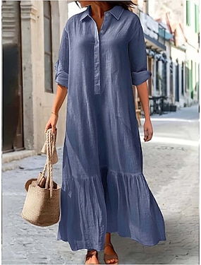 Per donna Abito Lungo Maxi Abito Finto cotone e lino Abito a Tubino Hawaiano Vestibilità regolare Tinta unica Manica Lunga Colletto a Camicia Aggiungi il blu reale Kaki Estate Primavera