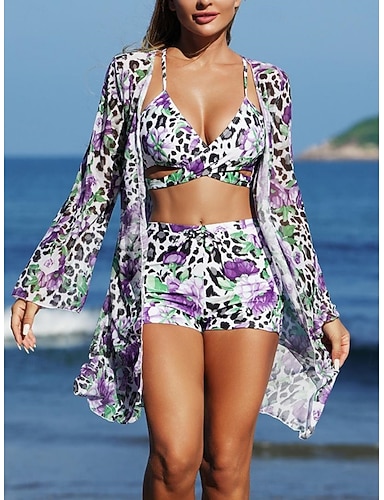 Bikini da donna in 3 pezzi costume da bagno con pantaloni corti senza schienale abbigliamento da spiaggia tropicale per vacanze grafica floreale scollo a V maniche lunghe