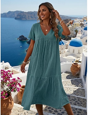 Per donna Abito Midi Abito a Tubino Abito Bianco Abiti in cotone e lino Abito in lino Casual Quotidiano Vacanza Vestibilità comoda Semplice Manica Corta Scollo a V Blu Nero Bianco Rosa Estate