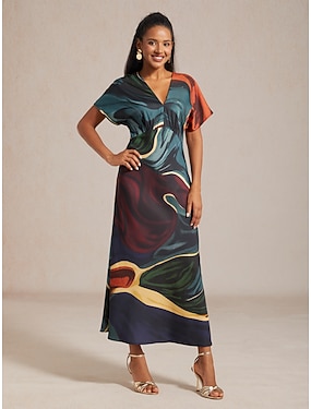 abito lungo da donna in raso con stampa astratta, manica a dolman, scollo a V, cintura, elegante, casual, vacanza, primavera estate autunno