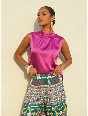 Top a maniche a pipistrello in raso setoso con motivo a fiori di Maiorca