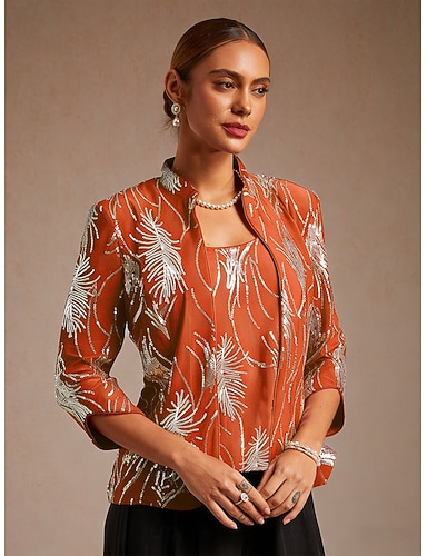 Per donna Top con paillettes Twinset Paillettes Piuma Elegante Manica 3/4 Collo alla coreana Top Regolari Ospite di nozze Arancione Primavera Autunno
