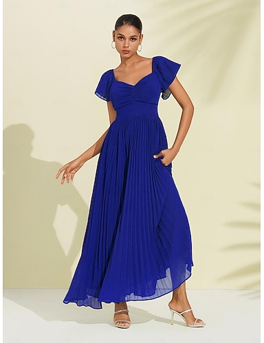 abito lungo a pieghe in chiffon blu reale per invitati a nozze/feste, linea a V, scollo a V, manica corta, per stupire 2024