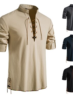 Per uomo Camicia Camicia di lino Stile vichingo Camicia Estiva Camicia da Spiaggia Camicia vintage Tinta unica Vacanza Casuale Nero Bianco Verde Manica Lunga Scollo a V Estate Primavera Abbigliamento
