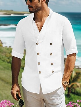 Per uomo Camicia camicia di lino Maglietta informale Camicia con bottoni Camicia di cotone Liscio Da mare Hawaiano Nero Bianco Verde Manica a 3/4 A fascia Estate Abbigliamento Tasche