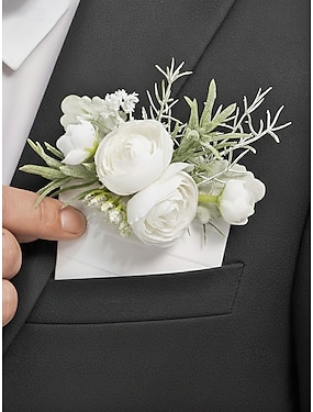 fazzoletto da taschino da uomo con fiore all'occhiello, in poliestere con finto fiore, colori bianco e rosa, design pratico, ideale per matrimoni e feste