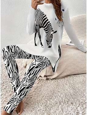 Set di pigiami da donna Pigiama Loungewear Collo rotondo Maniche lunghe Casual Moda Set di pantaloni Stampa grafica Animale Strisce Quotidiano Nero Bianco Viola Fit regolare