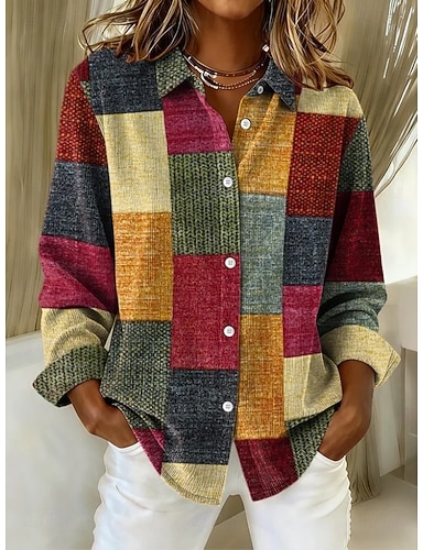 Per donna Camicia Blusa Patchwork Bottoni Stampato Grafico Geometrico Plaid Vintage Quotidiano Elegante Manica Lunga Colletto a Camicia Top Regolari Quotidiano Marrone rossastro Blu denim Giallo