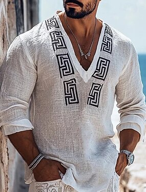 Per uomo Camicia Camicia di lino Camicia popover Camicia Estiva Abbigliamento da spiaggia Camicia etnica Geometrico Vacanza Ferie Bianco Manica Lunga Scollo a V Estate Primavera Abbigliamento