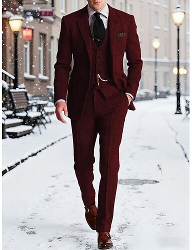 Uomo Smoking Abiti da festa Casuale Feste Borgogna Inverno Tuta Bavero a lancia Natale Quotidiano Tinta unita Vestibilità su misura 3 pezzi Monopetto Due Bottoni