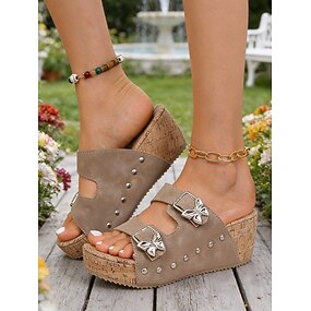 sandali con zeppa color cachi da donna – sandali estivi con tacco in sughero e borchie &fibbia ad arco per giardino, vacanza &abbigliamento casual